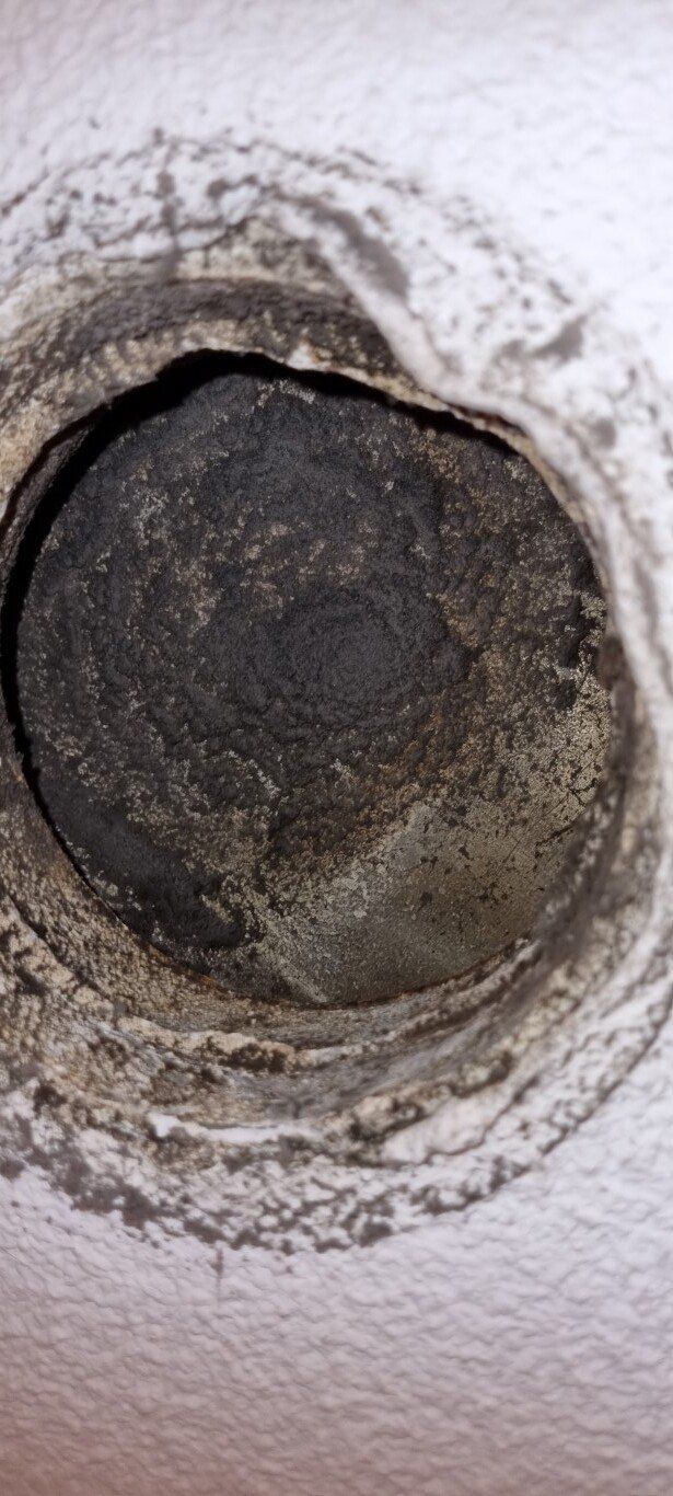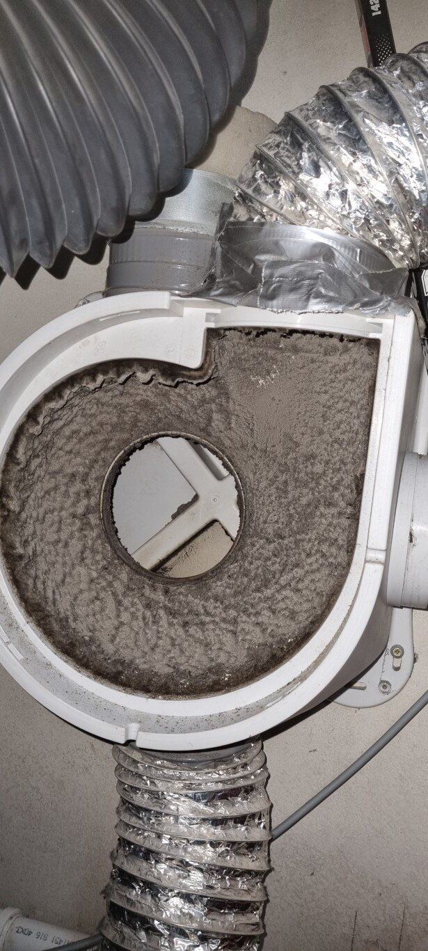 Ik begin dan altijd met het uitnemen van de roosters, maak ik foto's van de vervuiling en dicht de openingen af. En wow dit systeem was echt extreem vervuild met stof, met name het stuk kanaal van het toilet naar de schacht en de behuizing van de motor.
