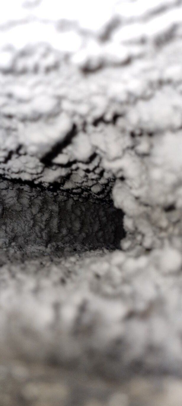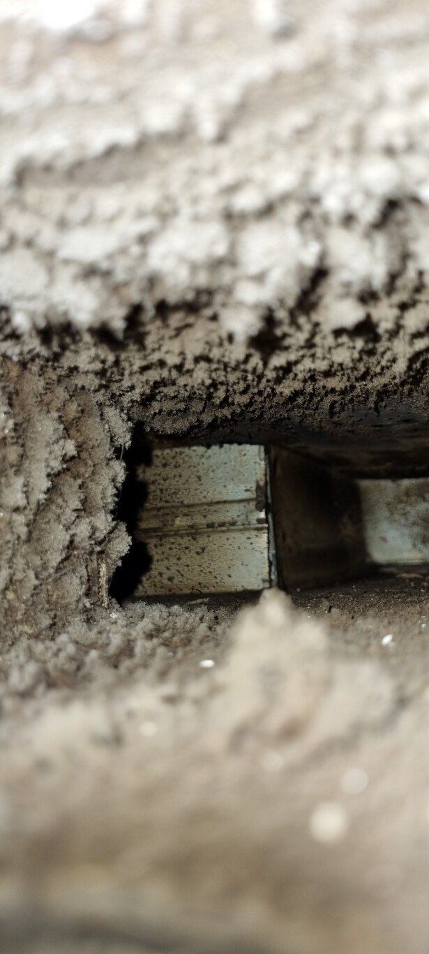 Nadat de roosters waren verwijderd en de openingen waren afgedicht (vacuum) begon ik het met het schoonblazen van de luchtkanalen dat was echt een mooie klus, van extreem vervuild met stof naar schone metalen wanden.
