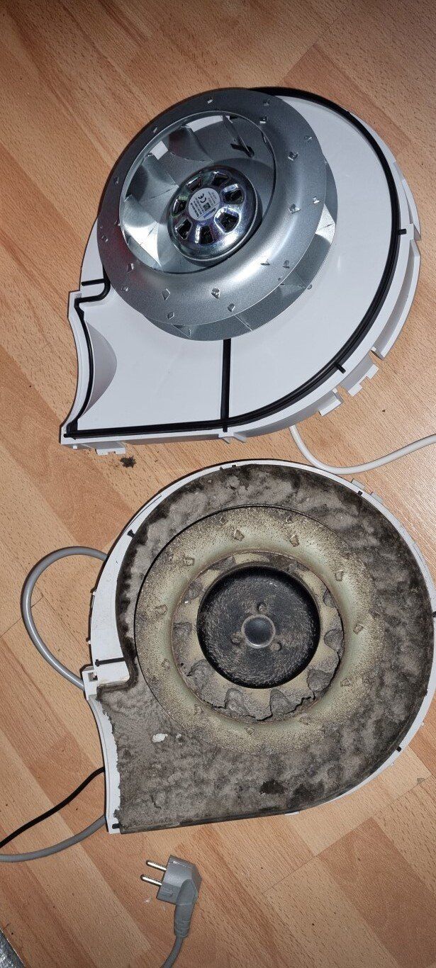 Nadat de kanalen waren gereinigd heb ik de motor verwijderd en ook hier trof ik een extreme stofvervuiling in de behuizing van de afzuigventilatormotor aan niet normaal meer.